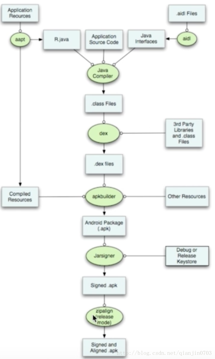- 将资源文件通过aapt编译生成R.java,将aidl文件通过aidl编译生成Java接口