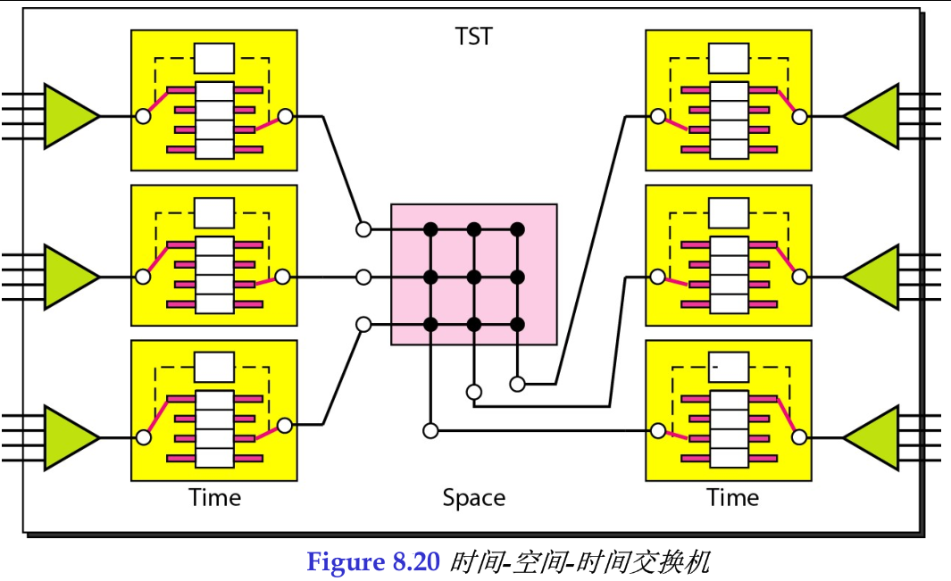 图8.20说明了一种简单的TST交换机,包括两级时分交换、一级空分交换,具有12路输入和12路输出。它不是使用一台时分交换机,而是将所有输入分3组(每组4个输入)并连接到3台时隙交换机中。这样做的结果是,平均延迟只是使用单一时隙交换机处理12个输入所产生的延迟时间的