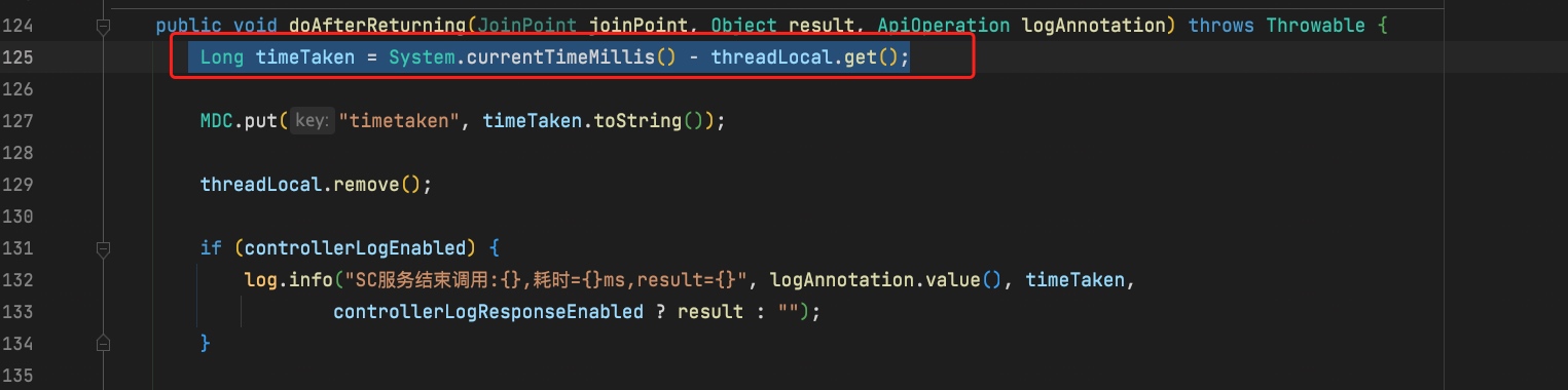 log.info("SC服务结束调用:{},耗时={}ms,result={}", logAnnotation.value(), timeTaken,