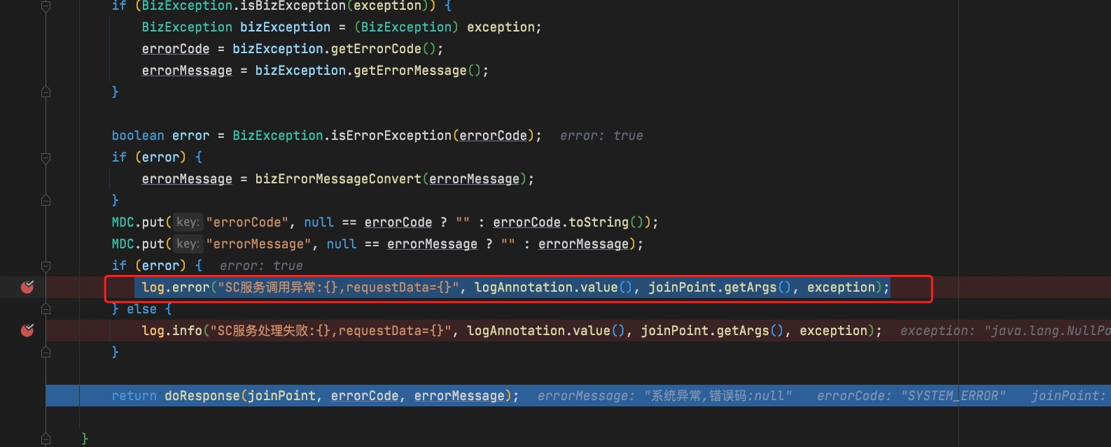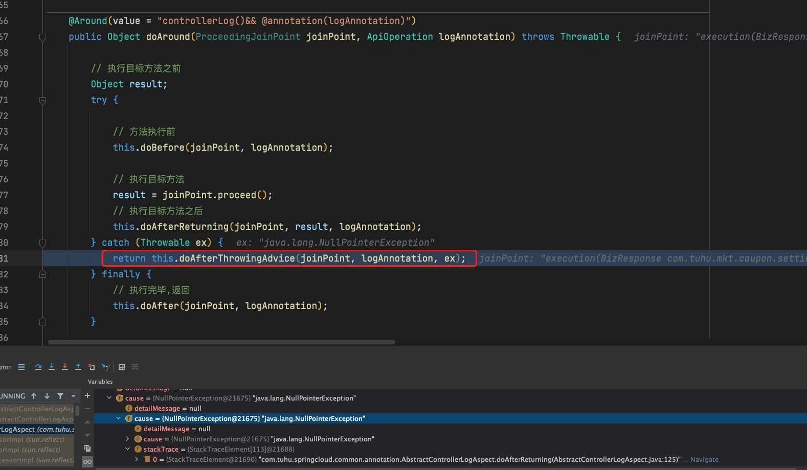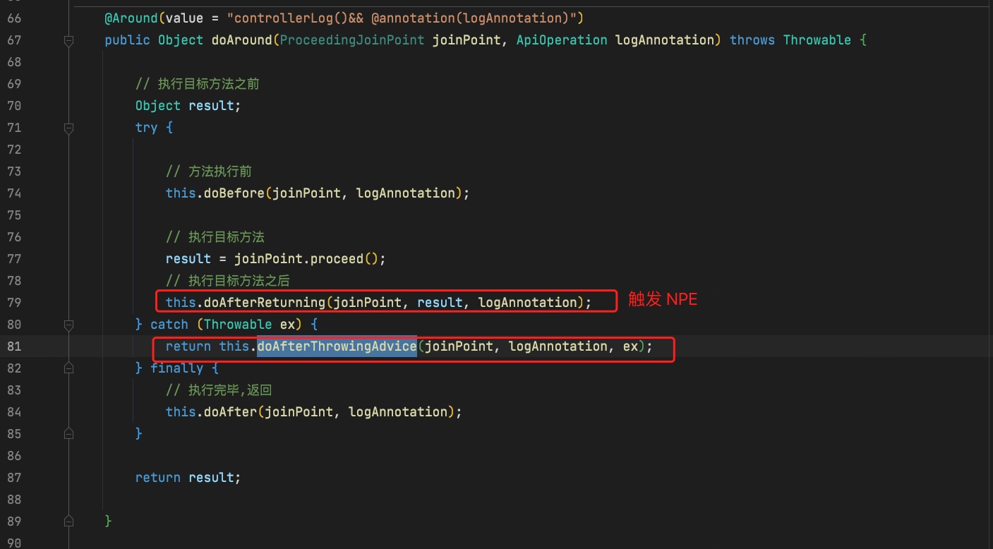 其中产生 NPE 的方法是这个 doAfterReturning(joinPoint, result, logAnnotation);