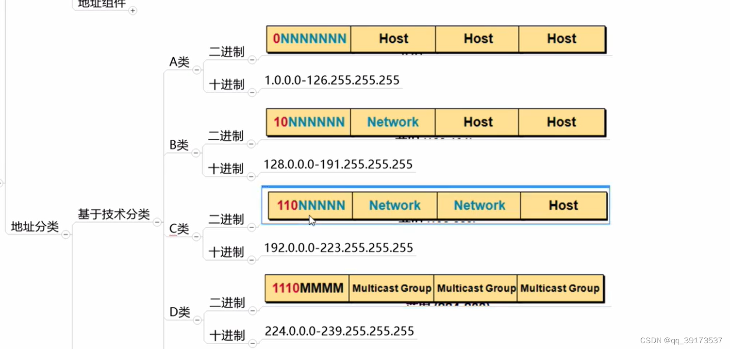 注明:A/B/C三类地址为商用地址即合法的ip地址,D类为组播地址。E类为科研IANA