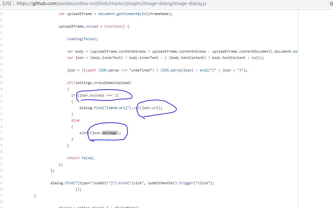 - 前端代码中的imageUploadURL字段是图片上传的地址,该功能要在后端视图中自己实现。本次图片存放在fastdfs分布式文件存储系统中,关于这个查看Django搭建fastdfs。后端返回的参数可以源码中查看获取,有三个参数:success、message、url,如下图所示: