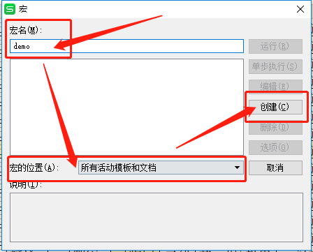3、点击宏,输入宏名(随便起个名字即可),宏的位置选择要拆分的工作薄,完成之后点击创建