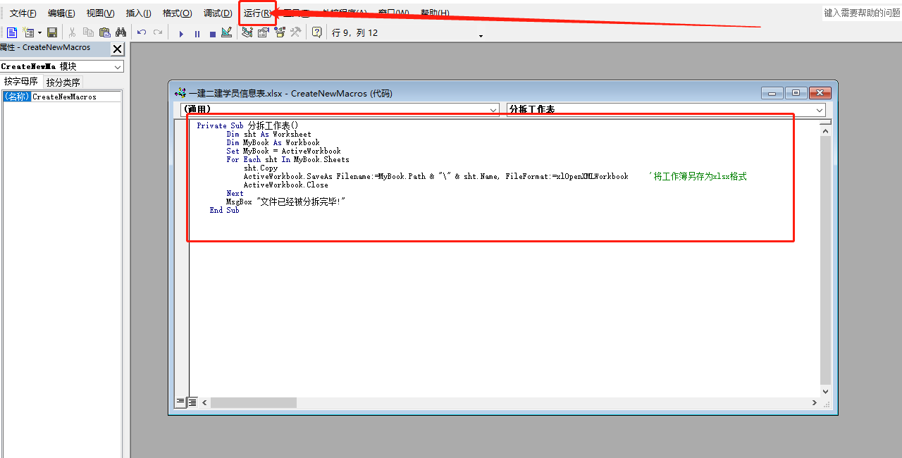 4、在代码的位置输入下面相对应的代码,然后点击运行->运行子过程/用户窗体,等待拆分完毕即可