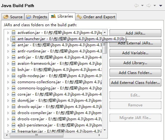 点击右边的Add External JARS...---->选择jbpm4.3目录下的所有架包--->然后点击确定就可以了---->可能源代码中还会有部分错误,这里先不讨论了