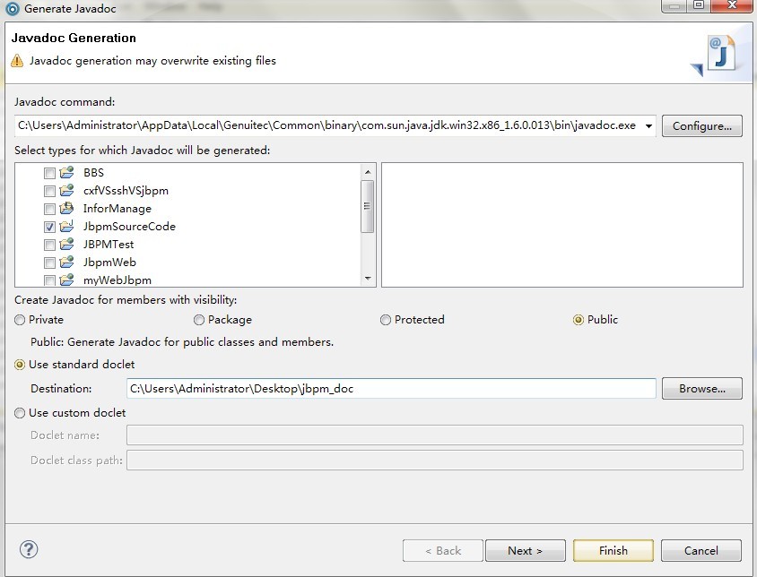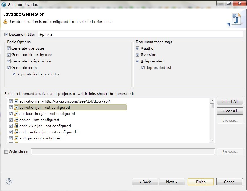 填写文档的标题和勾选所需的架包(这里默认勾选全部)---->点击finish------>现在就开始进行文档的生成了,可以看到控制台会答应很多的