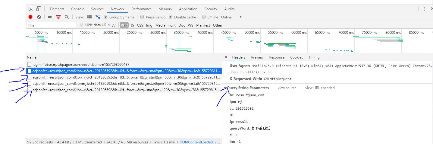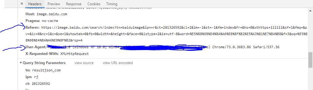 这个时候我就想到,这应该是通过js请求来获取到图片的。所以我下一个目标就是找到js请求的url及其所带的参数。为了方便省时,我并没有使用Fidder来分析,而是直接F12中的network中来查看。果不其然,成功找到了请求图片的url。如下图所示,随着你的鼠标向下滚动,js会不停请求,依此获得更多的图片。每个url请求的参数都可在Query String Parameters中查看。