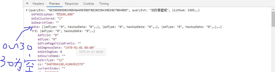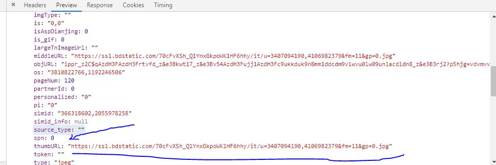 得到每一次的请求,我们的下一个目标就是得到每一次请求返回的30个图片的url。所以我们需要对请求的响应进行分析。可以发现它是以json的数据返回的。返回的内容最外面是一对{},我们所要的信息在key为data中。data的值是一个大小为31的数组,其中最后一个元素是一个空字典。data的每一个元素又是一个字典,而我们需要的图片url就在key为thumbURL内。如下图所示: