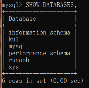 我们可以查看以下现在有的数据库了,除了我们自己创建的ku1和runoob,剩下的四个是MySQL自带的