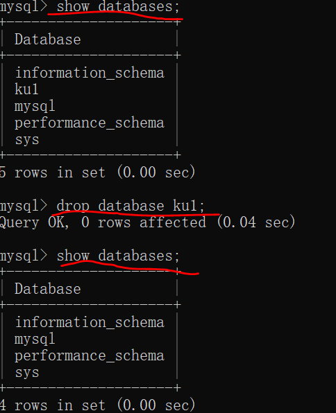 我的实例:删除名为ku1的数据库,(先查看原有的数据库,删除 ku1后,查看删除后的数据库)