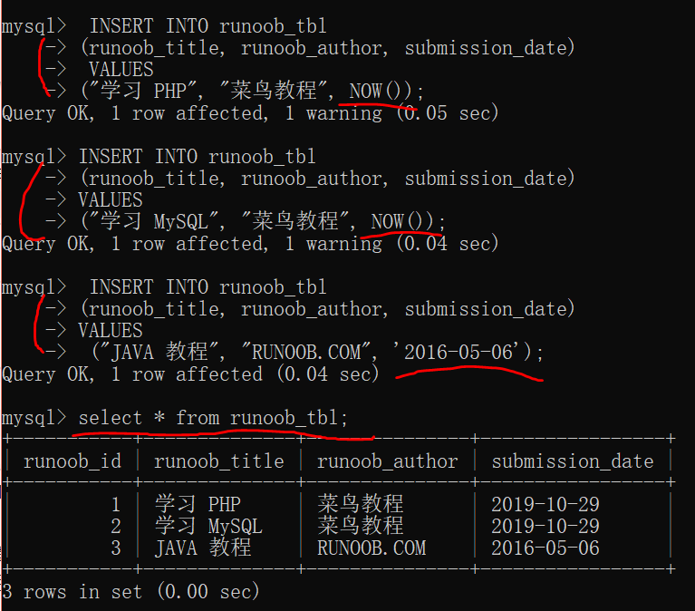 我的实例:向 runoob_tbl 表插入三条数据