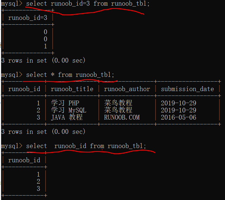 我的实例:查询 数据表 runoob_tbl 中runoob_id字段值为3的内容;查询 runoob_tbl所有内容;查询 runoob_tbl 中的runoob_id字段