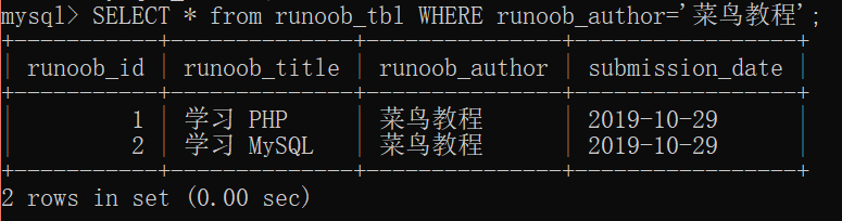 SELECT * from runoob_tbl WHERE runoob_author='菜鸟教程';