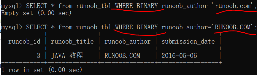 SELECT * from runoob_tbl WHERE BINARY runoob_author='runoob.com';