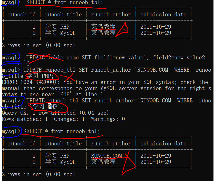 我的实例:更新数据表runoob_tbl中runoob_title为学习 PHP的runoob_author字段,更新为 RUNOOB.COM