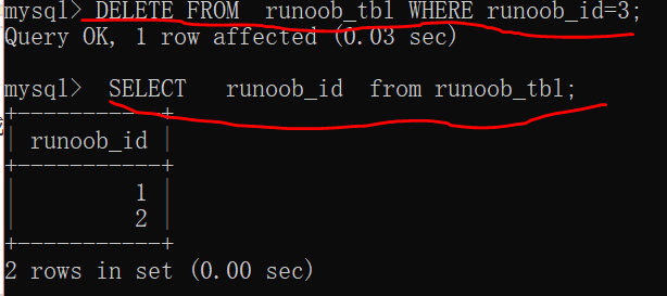 我的实例:删除 runoob_tbl 表中 runoob_id 为3 的记录 ,并选择runoob_id字段查看