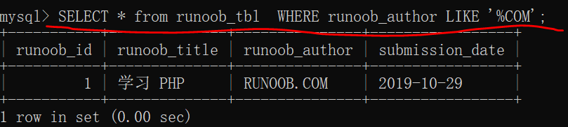 SELECT * from runoob_tbl WHERE runoob_author LIKE '%COM';