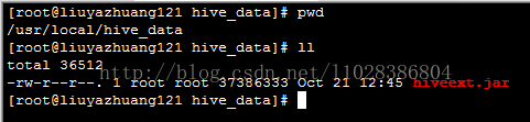 这里我们将Java工程在Eclipse下打包成Jar包hiveext.jar,并上传到服务器的/usr/local/hive_data路径下,如下图所示: