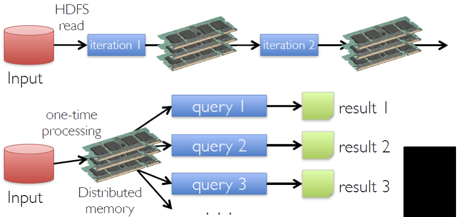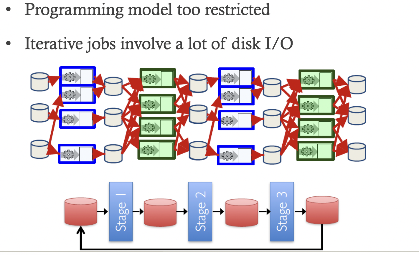 2、中间的文件储存在内存里,但是最后MR-output文件存在在文件系统里,涉及到磁盘读取的问题。在一个Map Reduce里存在大量Disk IO问题,效率很低