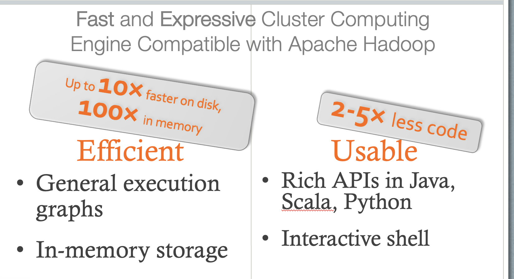 即使数据量过大,无法在内存里完全缓存,Spark也可以把数据缓存在Disk里,效率依然10倍于hadoop。