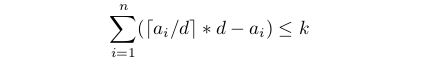 1 #include<iostream> 2 #include<cstdio> 3 #include<vector> 4 #include<cmath> 5 #include<algorithm> 6 using namespace std; 7 int n; 8 long long m,a[110],maxn; 9 vector<long long>ok; 10 int judge(long long x){ 11 long long len=0; 12 for(int i=1;i<=n;i++){ 13 int g=ceil((double)a[i]/(double)x); 14 len+=(long long)g; 15 } 16 //cout<<x<<" "<<len<<endl; 17 if(x<=m/len) return 1; 18 return 0; 19 } 20 int main(){ 21 scanf("%d%lld",&n,&m); 22 for(int i=1;i<=n;i++) scanf("%lld",&a[i]),m+=a[i],maxn=max(a[i],maxn); 23 // cout<<"fsdf"<<endl; 24 //maxn=1000000; 25 for(long long i=1;i<=m;i++){ 26 long long sg=0; 27 for(int j=1;j<=n;j++){ 28 sg+=ceil((double)a[j]/(double)i); 29 } 30 //cout<<i<<" "<<sg<<endl; 31 long long sb=m/sg; 32 //cout<<sb<<endl; 33 ok.push_back(sb); 34 i=m/(m/i); 35 } 36 long long ans=0; 37 sort(ok.begin(),ok.end()); 38 for(int i=ok.size()-1;i>=0;i--){ 39 // cout<<ok[i]<<endl; 40 if(judge(ok[i])){ 41 ans=ok[i]; 42 break; 43 } 44 } 45 printf("%lldn",ans); 46 }