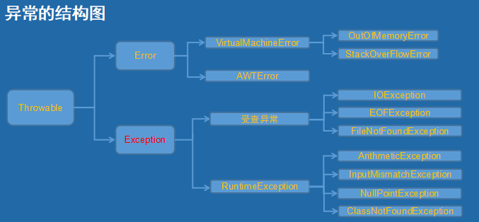 Throwable类是Java异常类型的顶级父类,一个对象只有是Throwable类的实例,他才是一个异常对象,才能被异常处理机制识别。JDK中内建了一些常用的异常类,我们也可以自定义异常