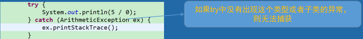 01.每一个catch块用于捕获并处理一个特定的异常,或者这异常类型的子类。