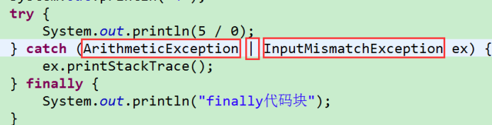 Scanner input = new Scanner(System.in); try { System.out.println("请输入第一个数字:"); int num = input.nextInt(); System.out.println("请输入第二个数字:"); int num2 = input.nextInt(); System.out.println("结果:"+(num/num2)); }catch(ArithmeticException e){ System.out.println("除数不能为0"); e.printStackTrace(); }catch (InputMismatchException e){ e.printStackTrace(); }finally { System.out.println("结束!"); }