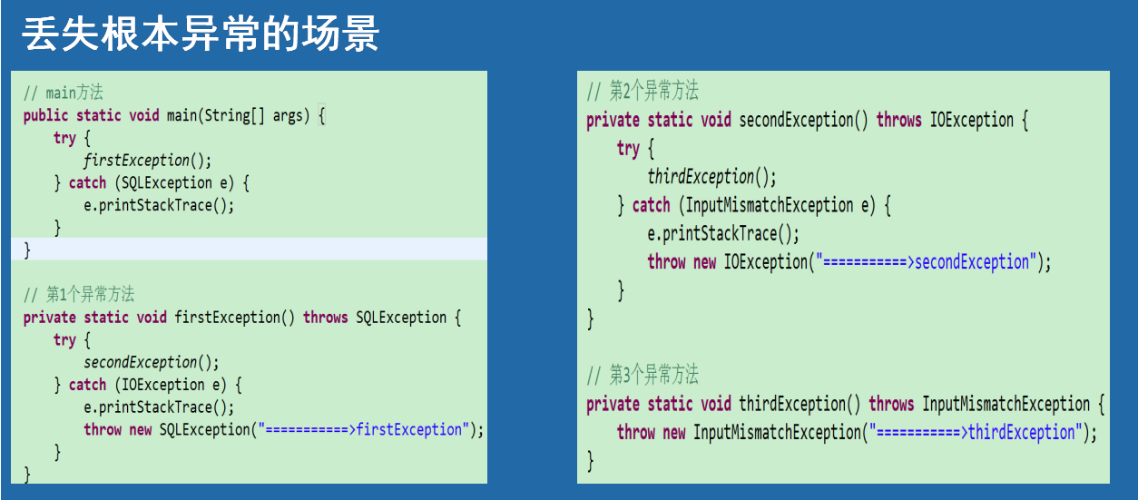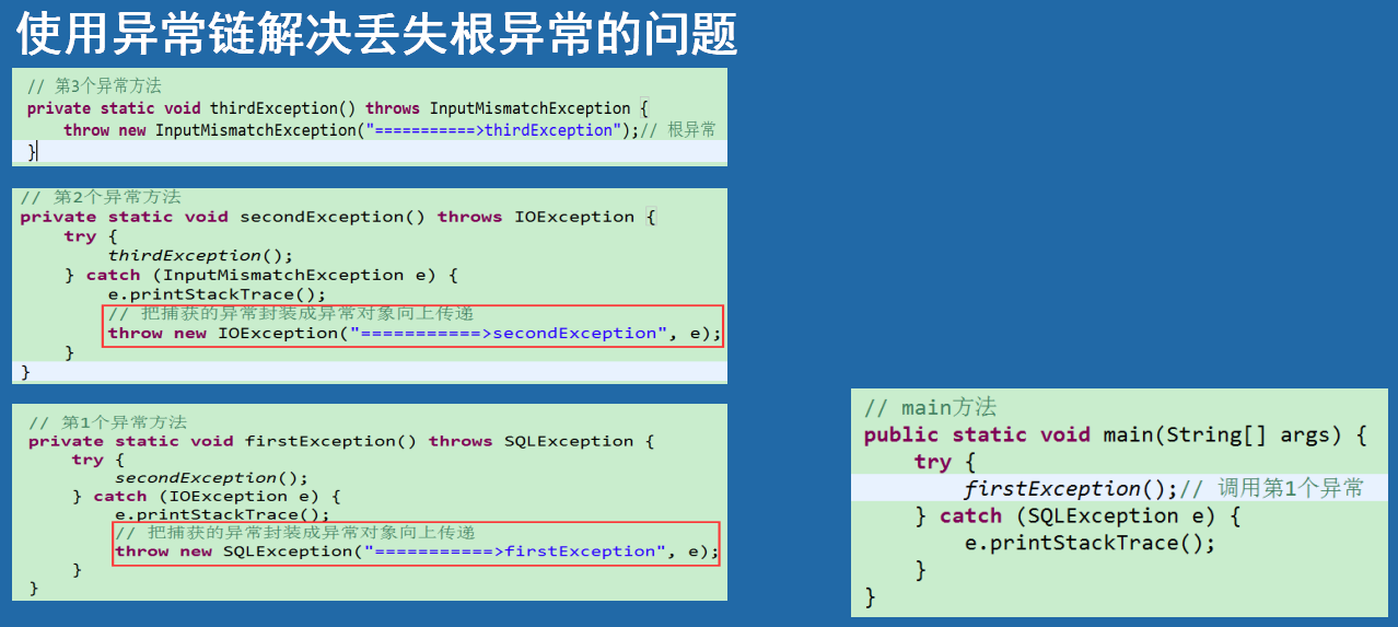 异常链是指将捕获的异常包装进一个新的异常中,新异常中记录了原始异常的信息。并重新抛出的异常处理方式。