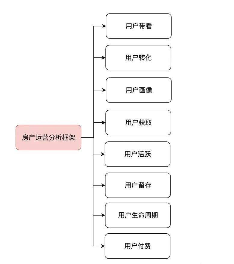 在做房产运营分析进行系统性描述时,最常使用的关键指标主要在于用户与业务场景,比如说项目,房源,客源,业主,带看,成交,认购以及用户线上线下行为等。