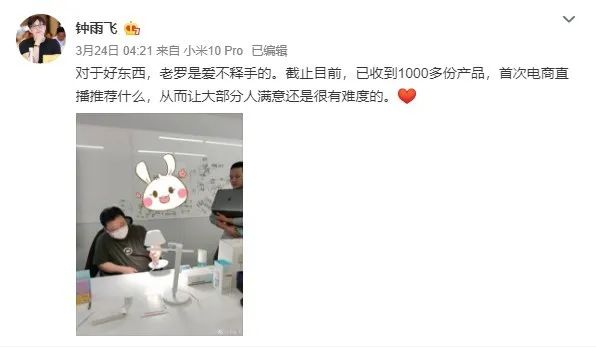 而此前,博主@钟雨飞在微博晒出一张疑似罗永浩在为直播带货做准备的照片。钟雨飞是谁?曾任小米新媒体总监,后离职创办电子烟品牌TAKI喜克,也是与老罗在多个风口狭路相逢或惺惺相惜的人。