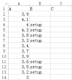现在需要找到 B 列是 setup 的连续记录作为一组,组内寻找 A 列最小的值,写在组内第 1 行的新列 C 上,结果如下: