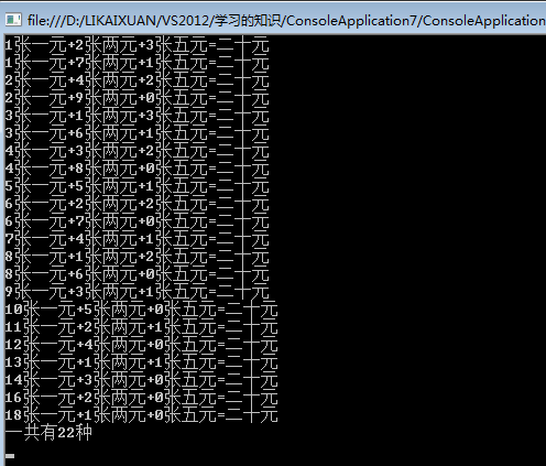 Console.WriteLine(x+"张一元+"+y+"张两元+"+z+"张五元="+"二十元");