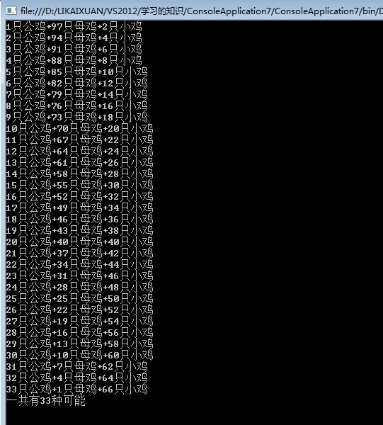 Console.WriteLine(x + "只公鸡+" + y + "只母鸡+"+z+"只小鸡");
