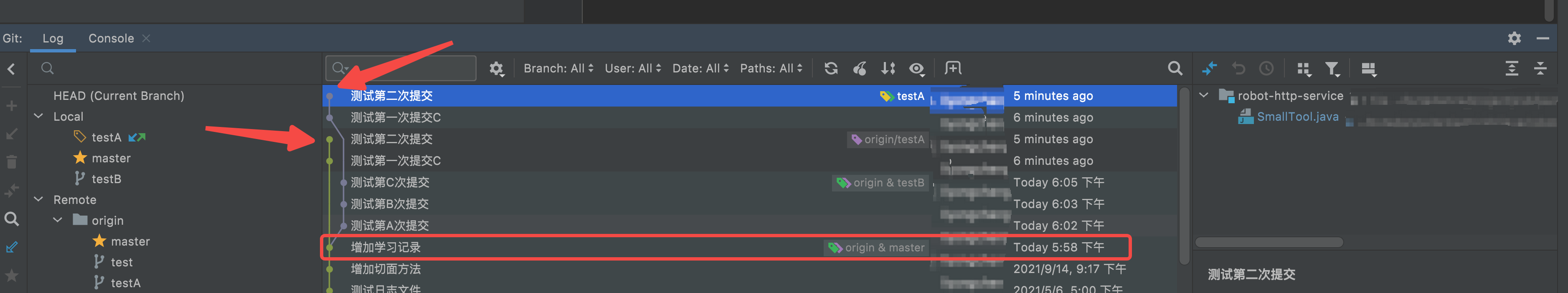 这样就把分支testB的提交记录提交到testA分支的提交记录前面了。