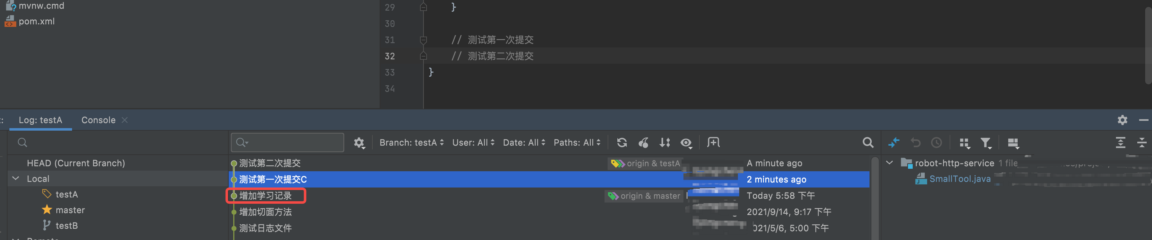 2 分支A的2次测试提交