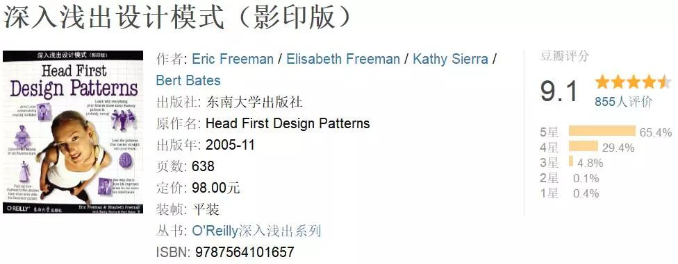 我是head first系列书籍的超级粉丝,无论是Head First Java还是Head First Design Pattern都非常不错。Head First Design Pattern中有很多很棒的例子,任何想要了解继承,封装,多态,抽象等面向对象基础知识的人都应该读读这本书。其中装饰模式(Decorator design pattern)和观察者模式(Observer design pattern)的内容都讲述的很棒。