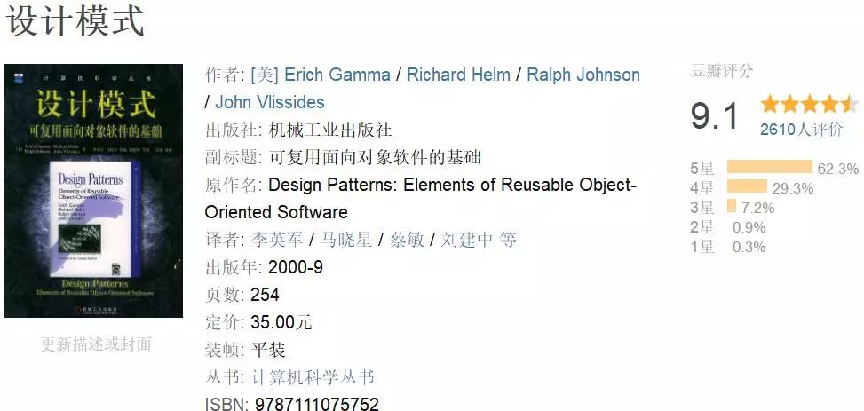 本书是四人帮经典的(GOF)设计模式书,迄今为止编写和发布的许多面向对象设计模式书籍都是借鉴这本书。任何必须阅读的Java设计模式书籍清单中没有出现这本书,都是不完整的。近20年来,本书仍然贴合当下的面向对象和Java模式设计。