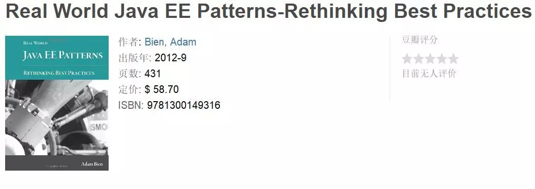 这本书是我们的读者推荐的。他说:“你学习Java EE模式你更应该阅读的书是Adam Bien的《Real World Java EE Patterns》,他会向你解释为什么你不应该再编写自己的DAO层。“ 我读了几个章节之后,觉得这位读者说的对,这是关于Java EE模式内容的最新书籍,也是Java EE开发人员必读的书籍之一。