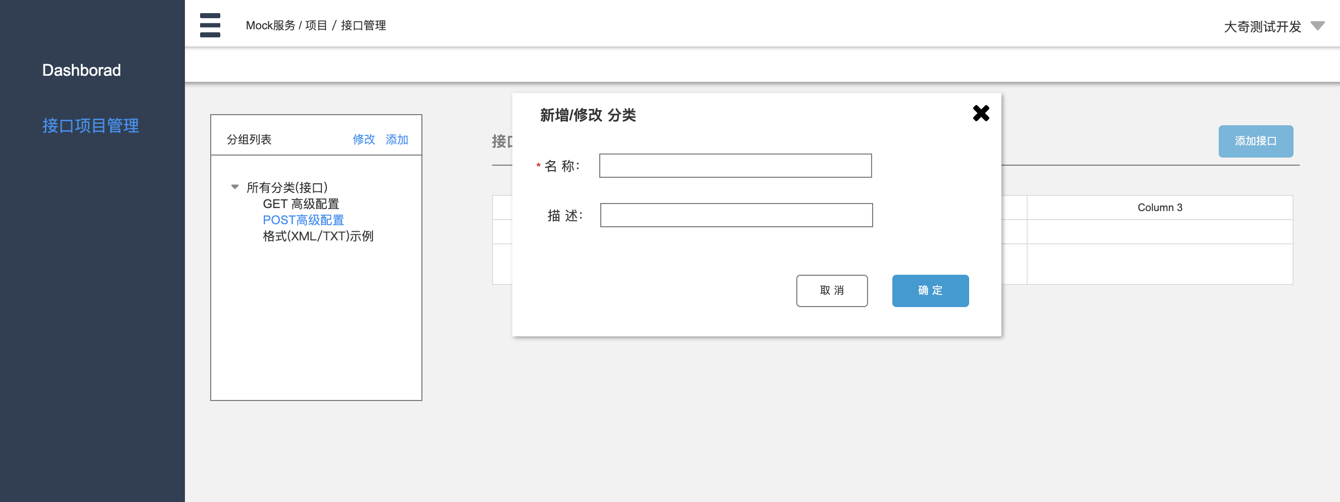接口的数量可能很多,这里增加一个分类tree功能,可以进行归类和查询,如原型图将其放在项目同页面的最左侧区域,方便直接切换过滤。