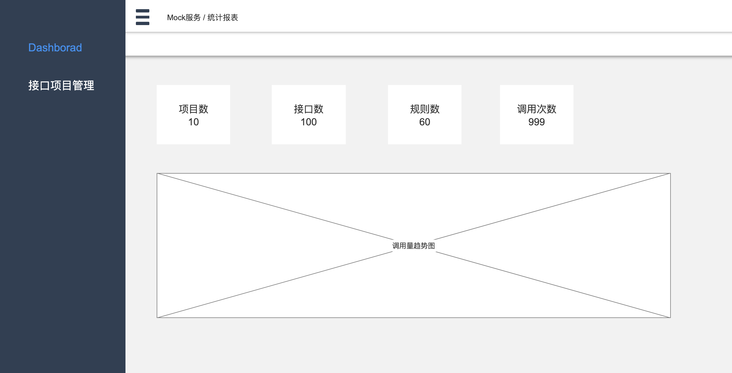 接口相关的数据统计,初步计划展示一些概要汇总,以及调用的趋势图,这里趋势的统计需要依赖后段服务做个请求日志存留,详细界面和数据内容做到的时候在详细说明,此处仅做个概要原型预览。