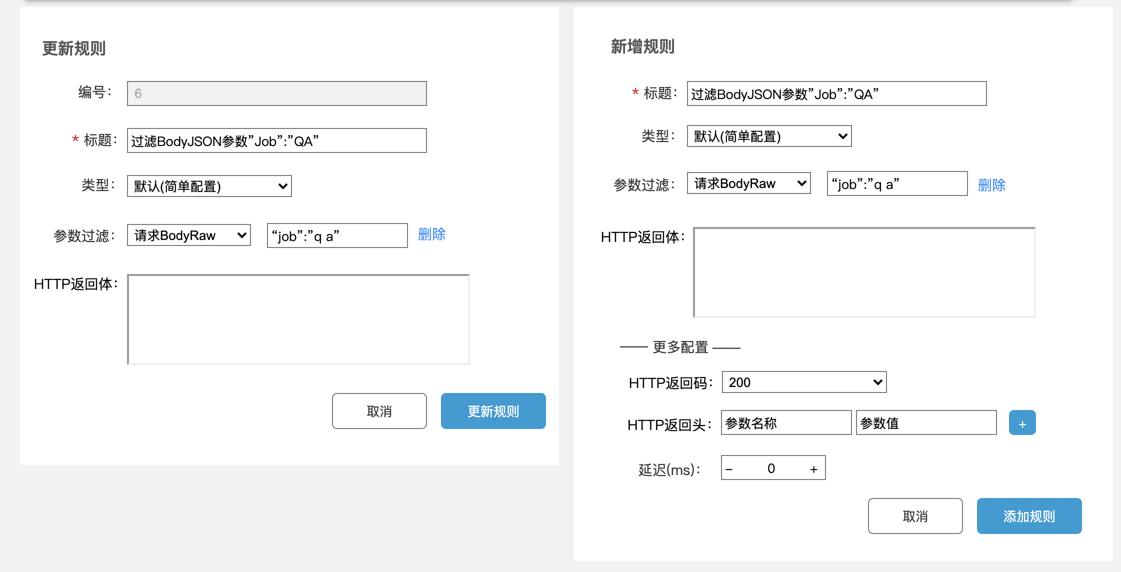 - 默认返回:接口在没有规则配置的情况的默认返回,非必填,如果没有设置并且Mock逻辑拿了这个值则为空;