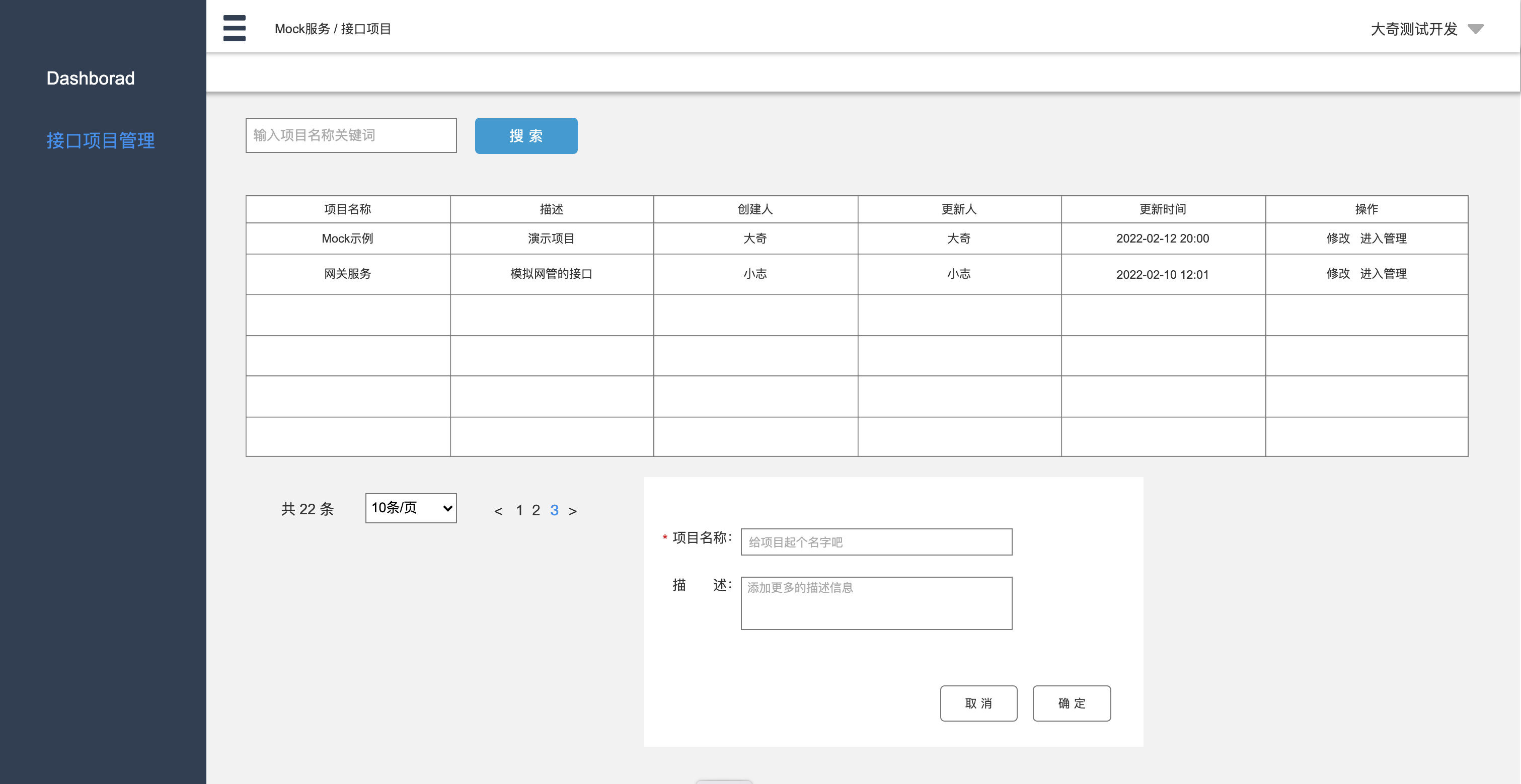 - 添加和编辑对话包含项目名称(必填)和描述,确定提交成功后进列表刷新