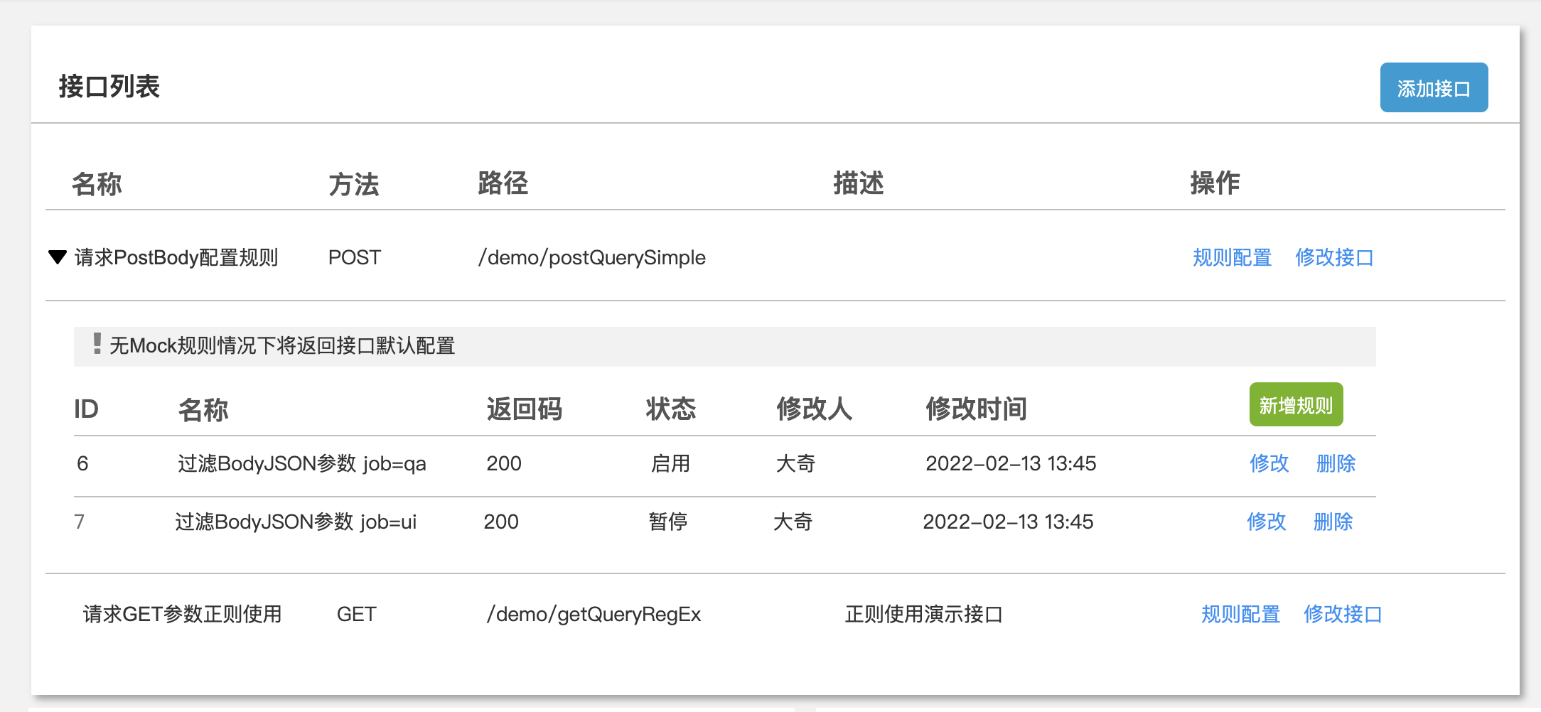 为了交互上的便捷,通过接口表行点击扩展页面来实现规则的增删改操作,规则主要针对请求参数规则匹配然后返回不同的Body,本系列上通过一种简单的方式 正则表达式 来实现匹配逻辑,更好一点交互是做到 param/body的key-value形式。