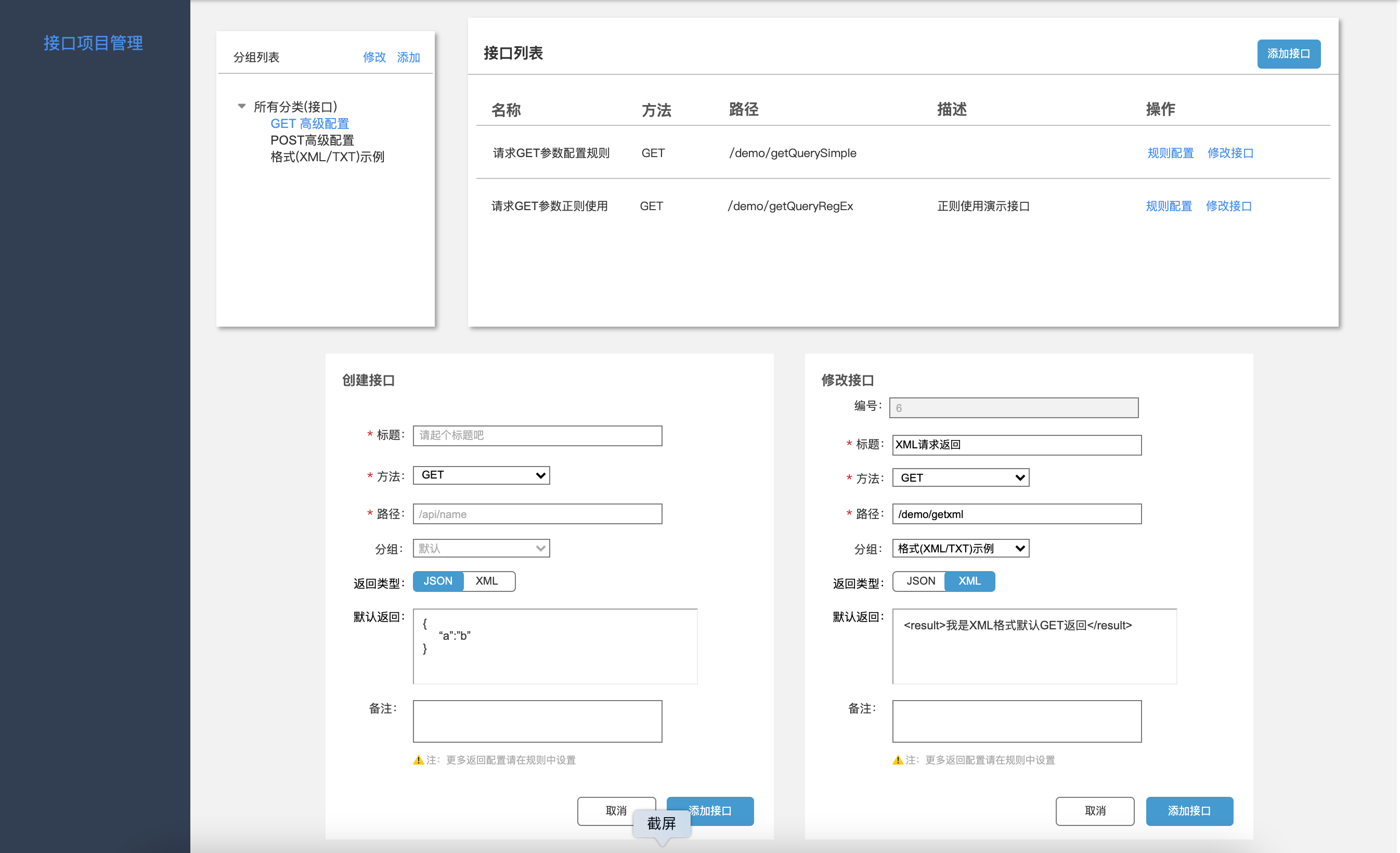 平台核心功能,实现标准HTTP接口的录入和管理,涉及的核心字段包括但不限于方法、路径、返回值,提前说明一点的是,接口只做基本配置和默认返回,更多高级的配置玩法将在规则管理中实现。