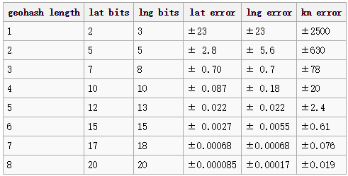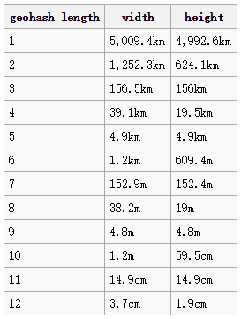 由于GeoHash是将区域划分为一个个规则矩形,并对每个矩形进行编码,每个精度等级对应的规则矩形大小为: