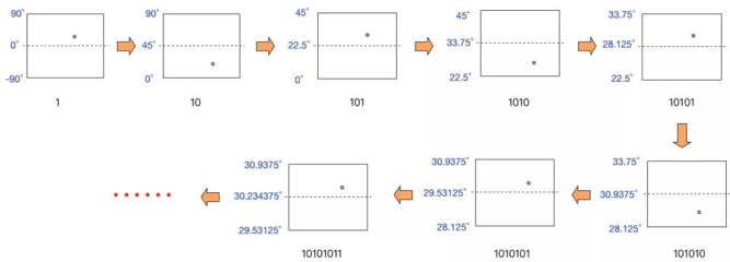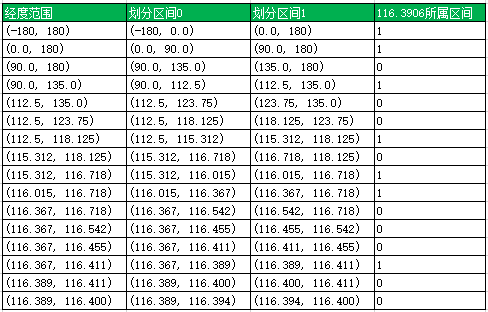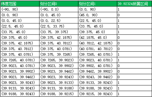 首先将纬度范围(-90, 90)平分成两个区间(-90,0)、(0, 90),如果目标纬度位于前一个区间,则编码为0,否则编码为1。然后再将(0, 90)分成 (0, 45), (45, 90)两个区间, 以此类推,直到精度符合要求为止,得到纬度39.92324编码为1011 1000 1100 0111 1001。