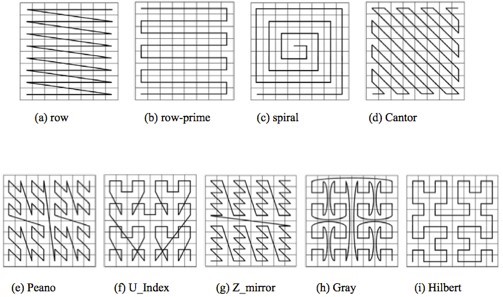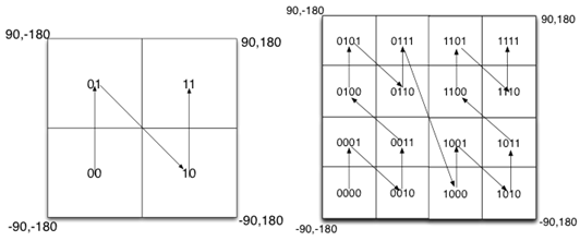 如图所示,我们将二进制编码的结果填写到空间中,当将空间划分为四块时候,编码的顺序分别是左下角00,左上角01,右下脚10,右上角11,也就是类似于Z的曲线,当我们递归的将各个块分解成更小的子块时,编码的顺序是自相似的(分形),每一个子快也形成Z曲线,这种类型的曲线被称为Peano空间填充曲线。