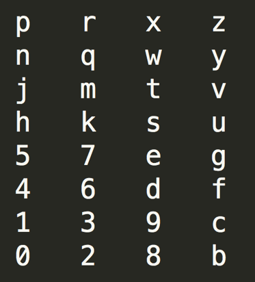 通过观察GeoHash编码表的规律,结合GeoHash编码使用的Z阶曲线的特性,验证了一种通过查表来快速求相邻GeoHash字符串的方法。还是以“wtmk72”这个GeoHash字符串为例,对应的10进制数是“28,25,19,18,7,2”,转换成二进制就是11100 11001 10011 10010 00111 00010。其中,w对应11100,这5个二进制位分别代表“经 纬 经 纬 经”;t对应11001,这5个二进制位分别代表“纬 经 纬 经 纬”。由此推广开来可知,GeoHash中的奇数位字符(本例中的’w’、’m’、’7’)代表的二进制位分别对应“经 纬 经 纬 经”,偶数位字符(本例中的’t’、’k’、’2’)代表的二进制位分别对应“纬 经 纬 经 纬”。’w’的二进制11100,转换成方位含义就是“右 上 右 下 左”。’t’的二进制11001,转换成方位含义就是“上 右 下 左 上”。根据这个字符与方位的转换关系,我们可以知道,奇数位上的字符与位置对照表如下: