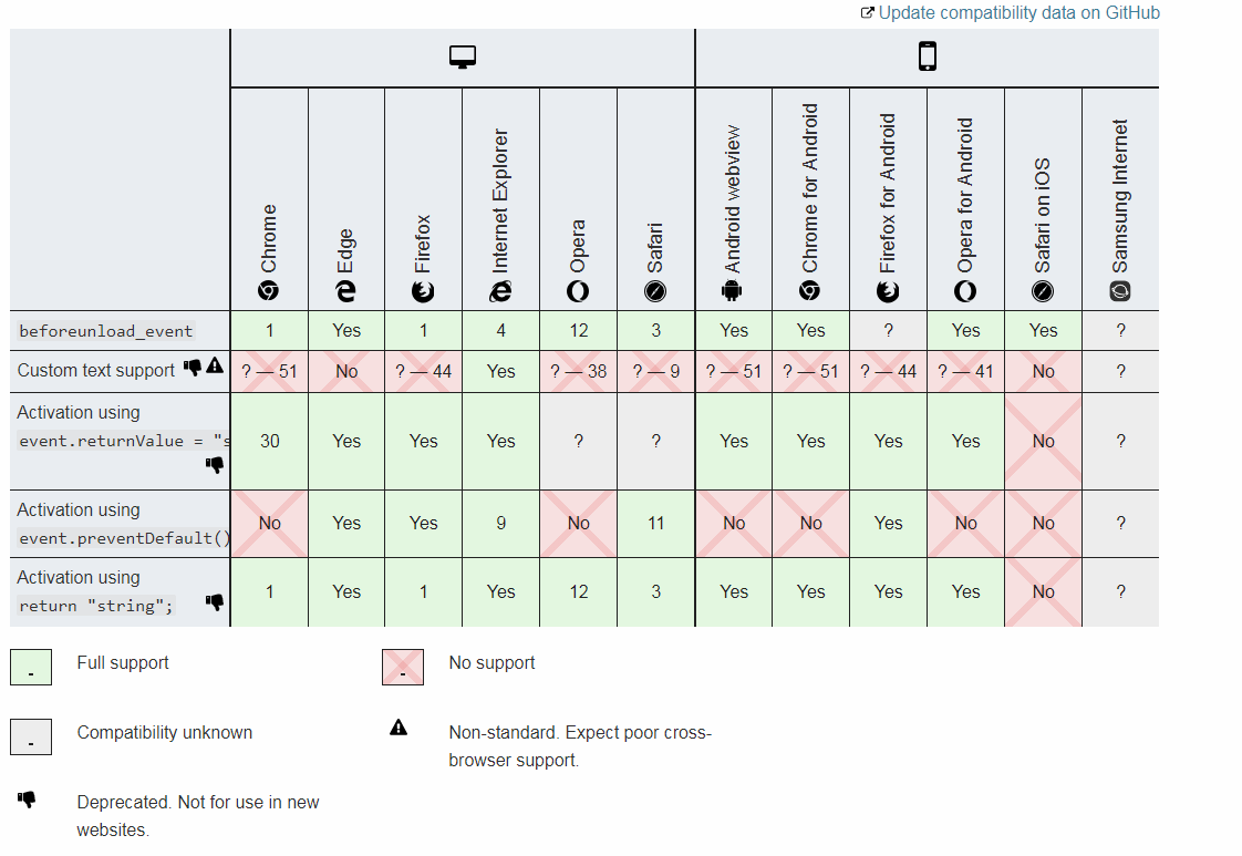 兼容详图 地址 https://developer.mozilla.org/en-US/docs/Web/API/Window/beforeunload_event